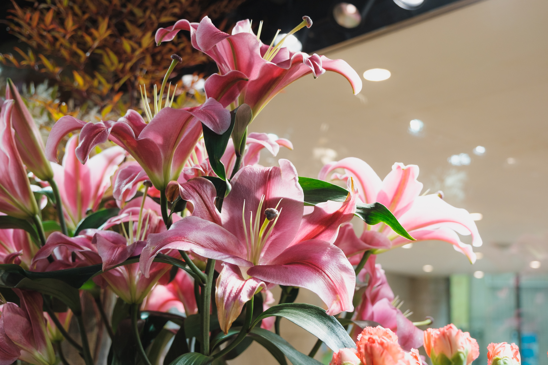 盛開的粉紅色及半開的白色百合佔據店內當眼位置,就像置身上環老巷,目不暇給。