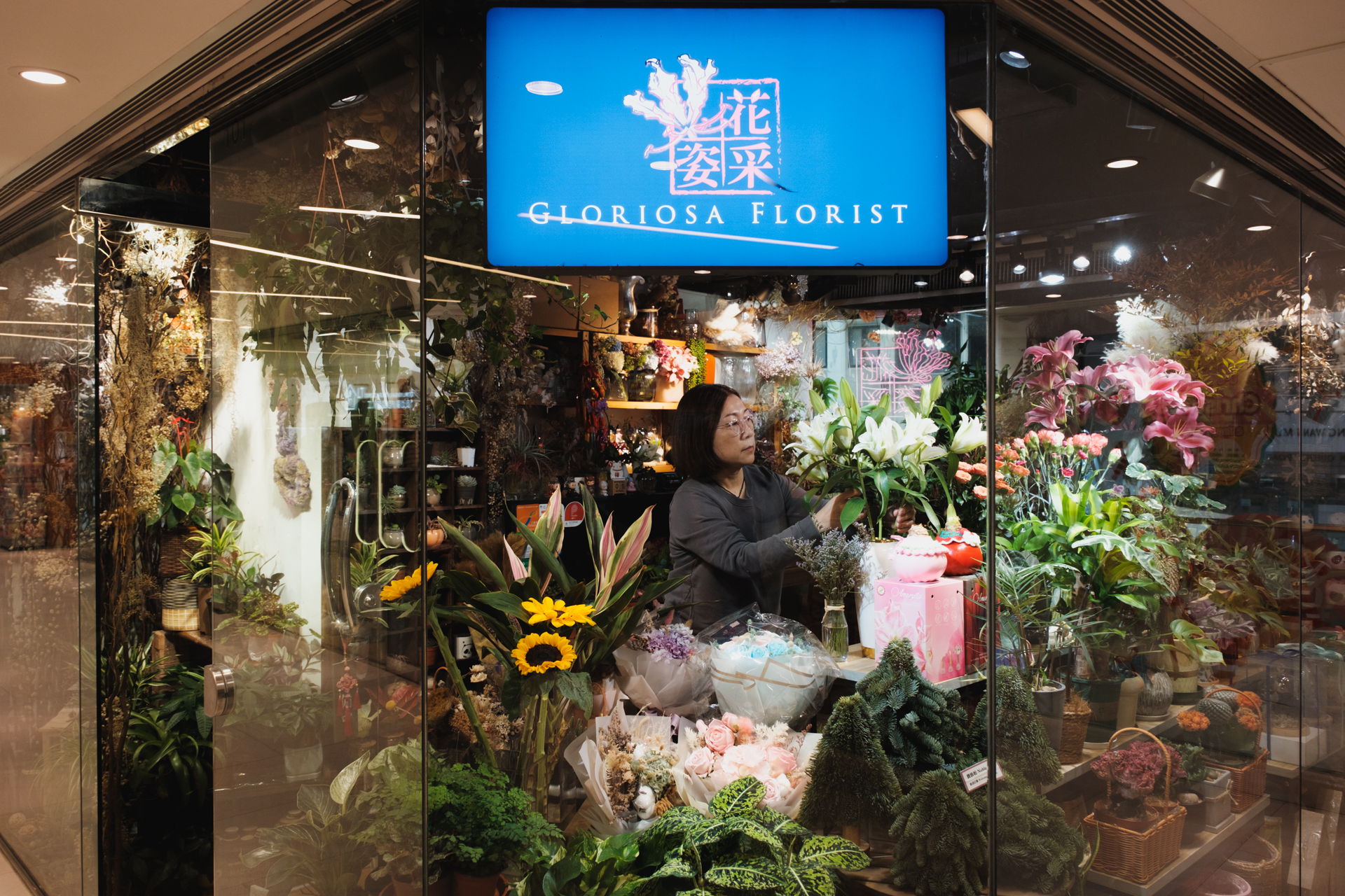 正午陽光灑落花姿采的落地玻璃,被映照的盆栽顯得特別翠綠,花卉顏色更顯鮮豔,遠看只見植物不見人,踏進「花花世界」才聽到熱情招待的聲音。作為上環「新成員」的花姿采,座落偉利廣場一樓的角落。她在兩年前初到貴境,「機緣巧合就遇到呢間店,我自己都好鍾意,就喺呢度做一個小小負責人,每日喺度執花、紮花。」