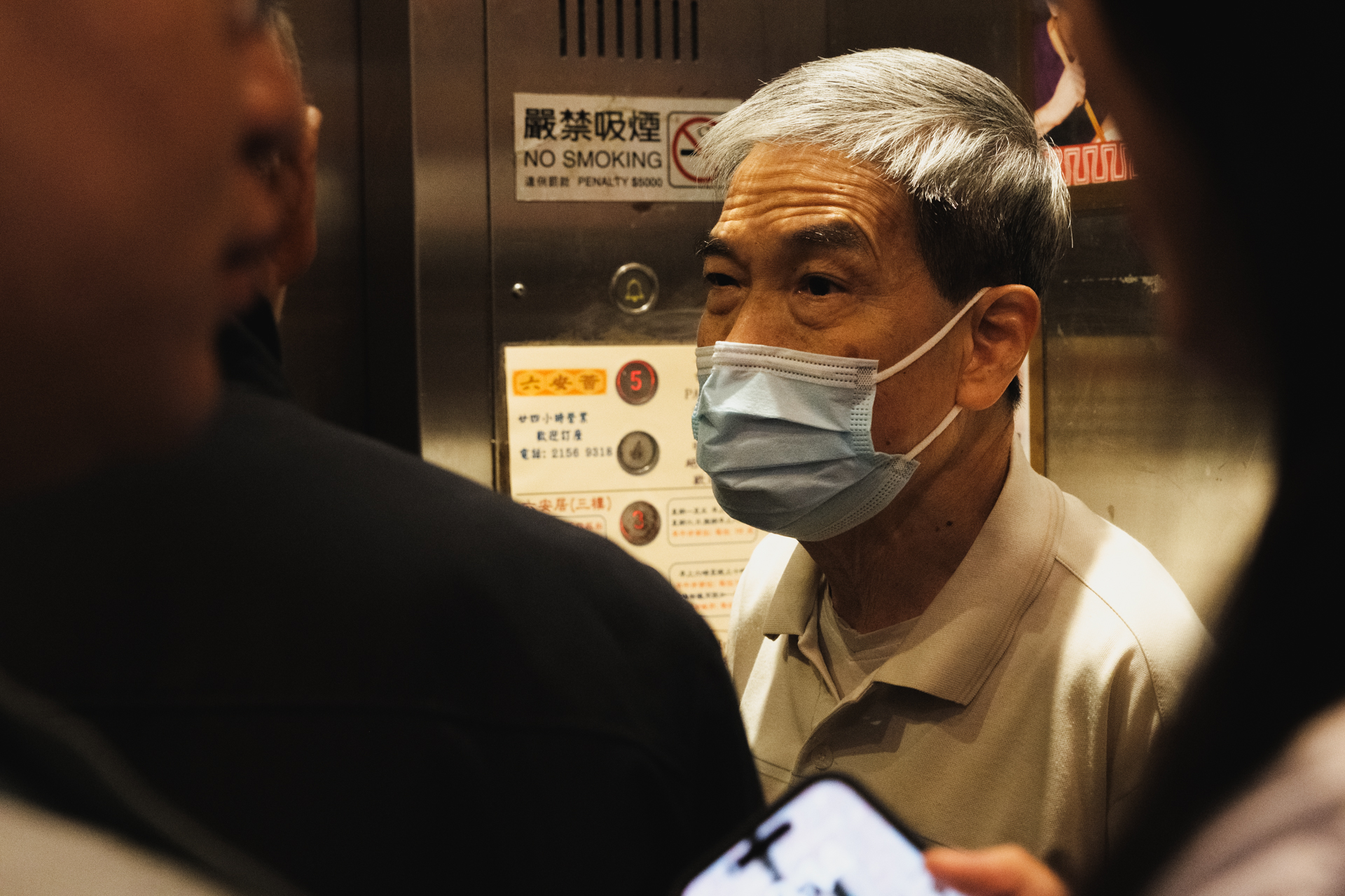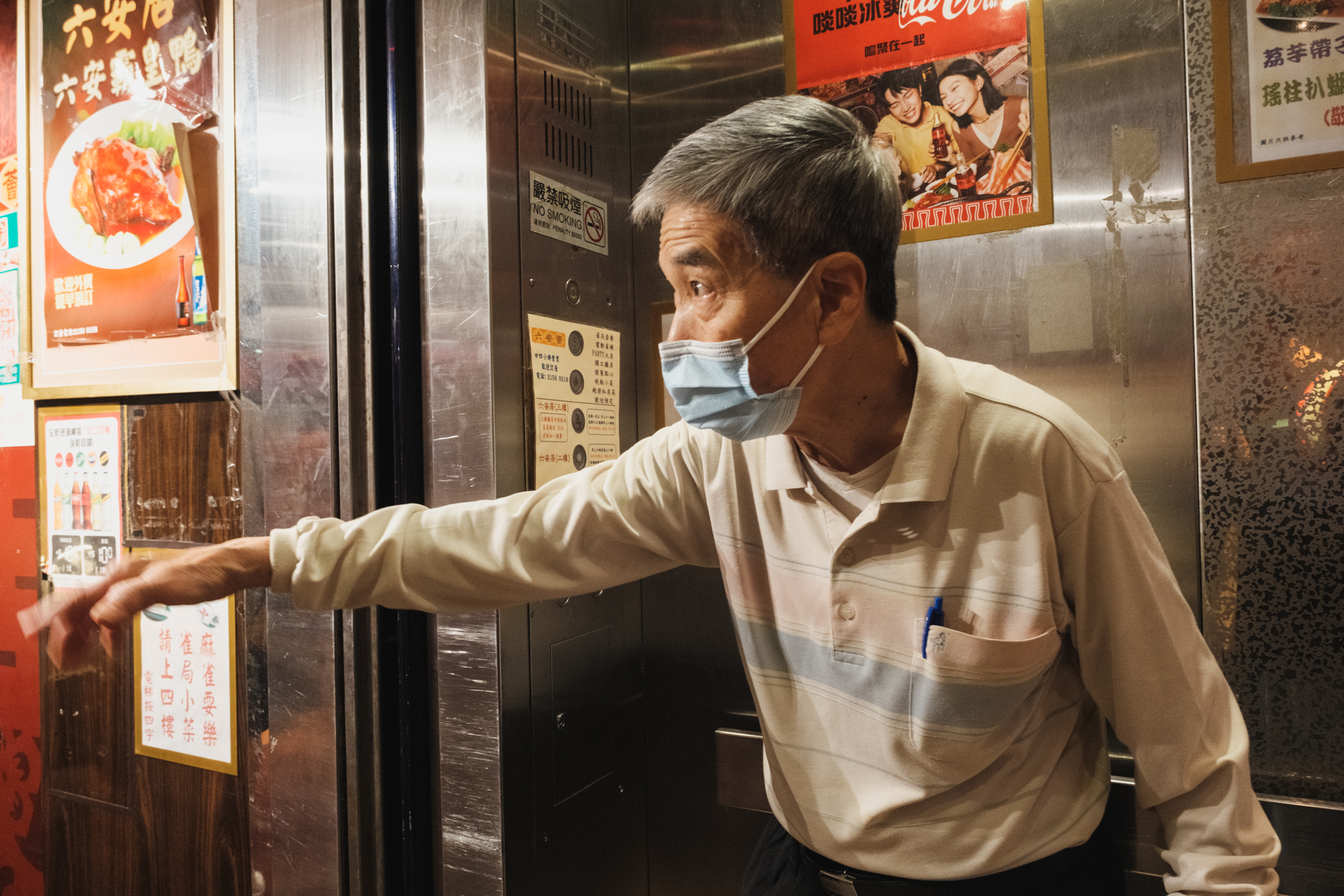 甫開𨋢門,便見一頭白髮、戴上口罩的王柏榮(榮叔)招手,「入來,幾樓?幾樓?」他的行動與語速同樣迅速,未及反應已被他引領到各樓層,又不時用半咸淡的普通話、數句英語與遊客打招呼,笑言是要借機收集食客評語,「喺部𨋢度問客人『好吃?好吃?』,有時會聽到『喂!你有伙記鬧人!』」除非是熟客,不然誰會知道「揸𨋢」的就是老闆?每天如是,中午12點開始做一個多小時,情報就是這樣收集回來的。